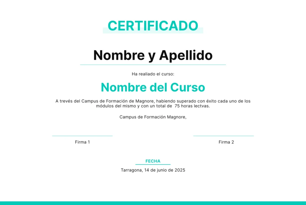 En Magnore te ayudamos a que tus cursos cumplan con los requisitos exigidos por los organismos acreditadores (como la Comisión de Formación Continuada del SNS o universidades), y automatizamos todo el proceso de certificación.